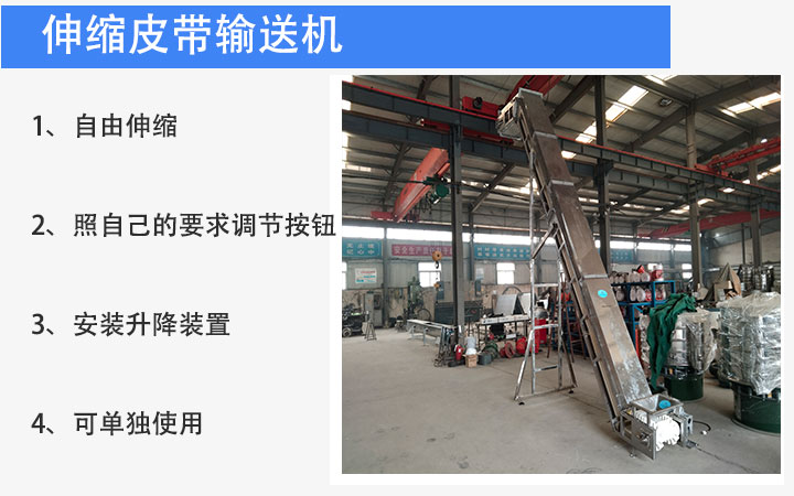 伸缩皮带输送机是在普通皮带输送机上增加了伸缩机构,可以在长度方向上自由伸缩,随时控制输送机的长度,可双向输送物料,也可与其他设备配合使用,以实现物料出入库或车辆装卸的自动化生产,缩短了人工往返搬运物料的距离,可以缩短货物装卸货时间,降低劳动强度,降低装卸成本,提高工作效率。