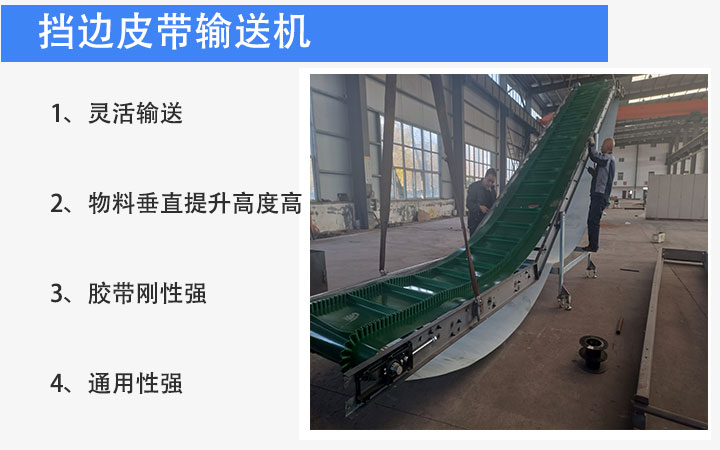 挡边皮带输送机又叫波纹挡边皮带输送机,是在平形橡胶运输带两侧粘上可自由伸缩的橡胶波形立式“裙边”,在裙边之间又粘有一定强度和弹性的横隔板组成匣形斗,对物料进行连续输送的设备。可大倾角输送甚至垂直提升散料。